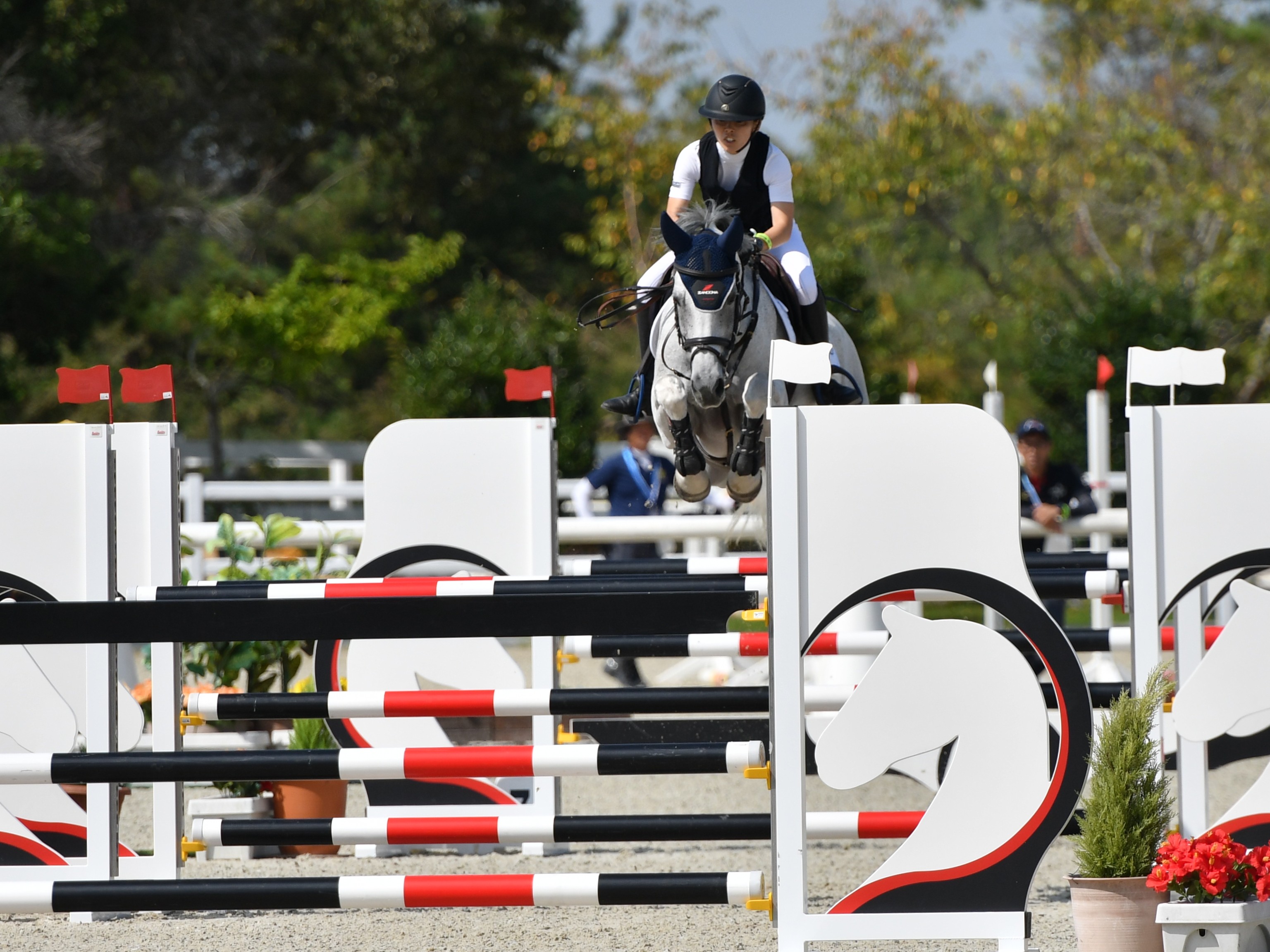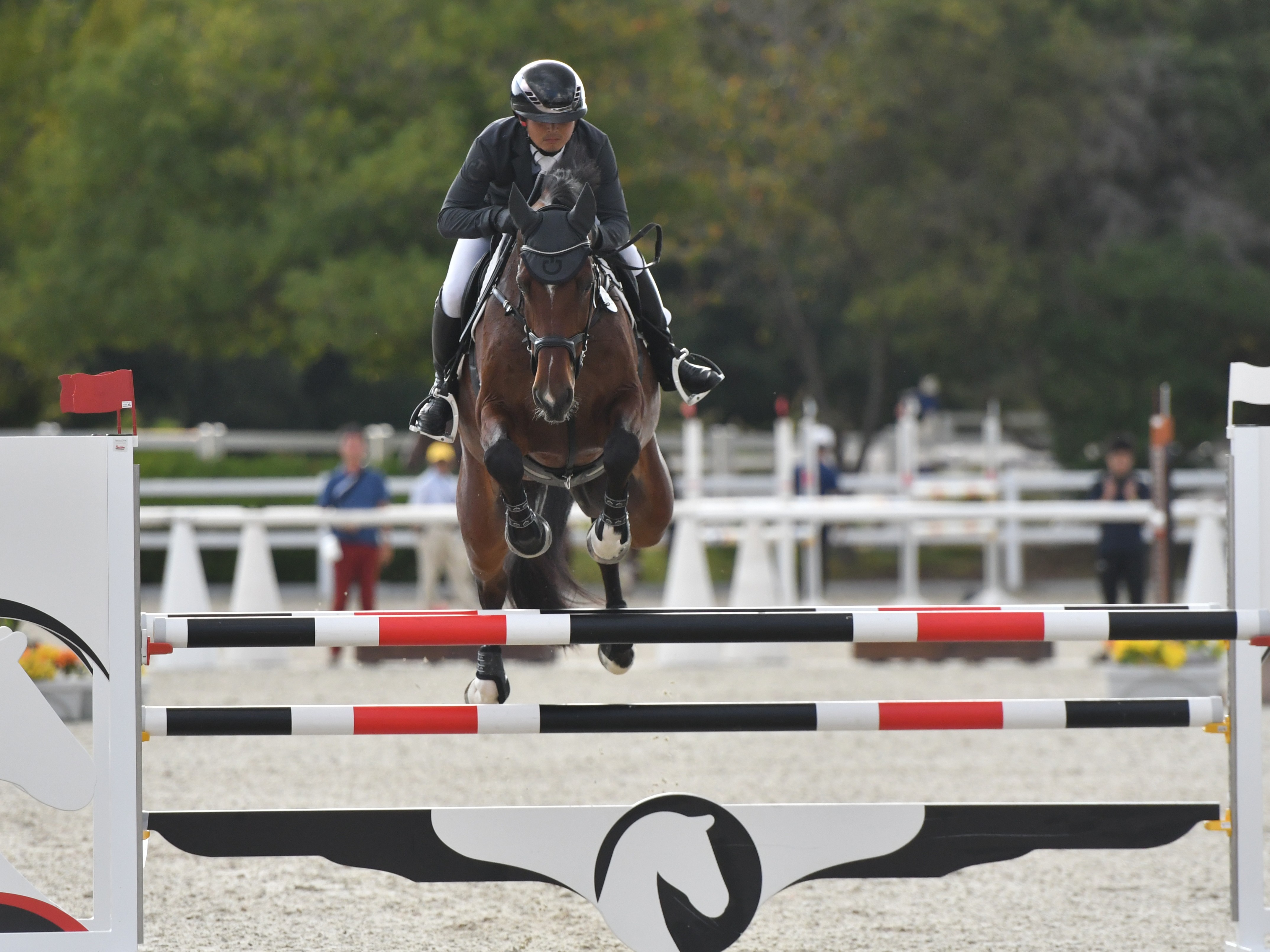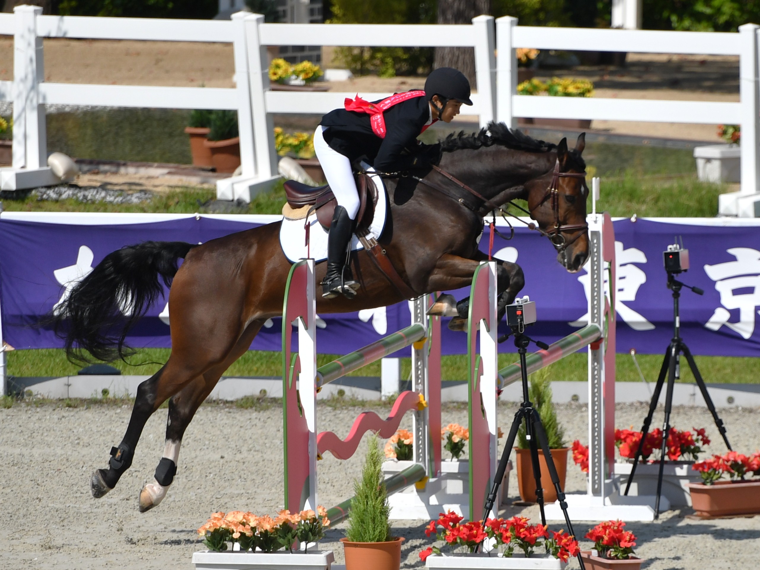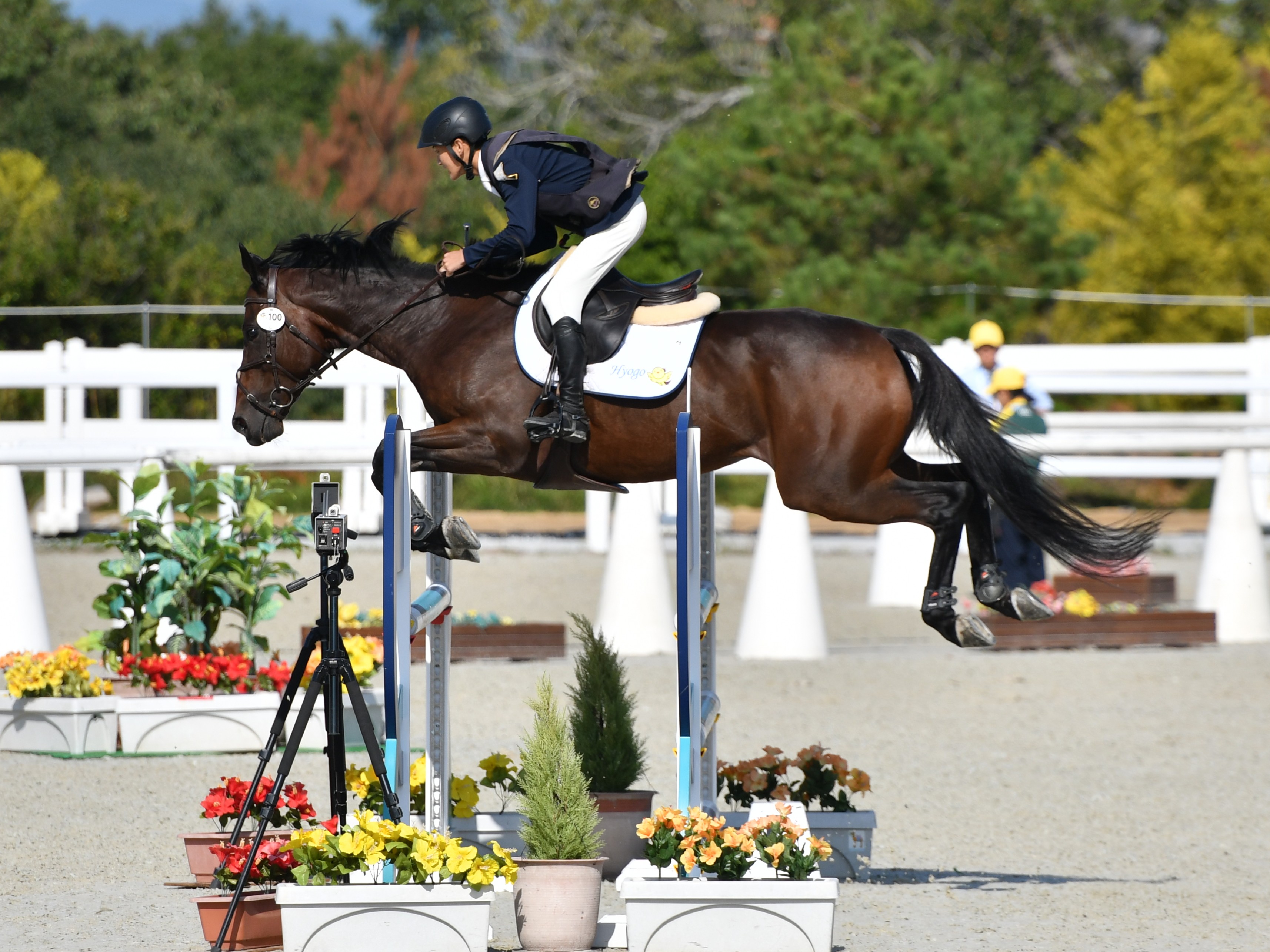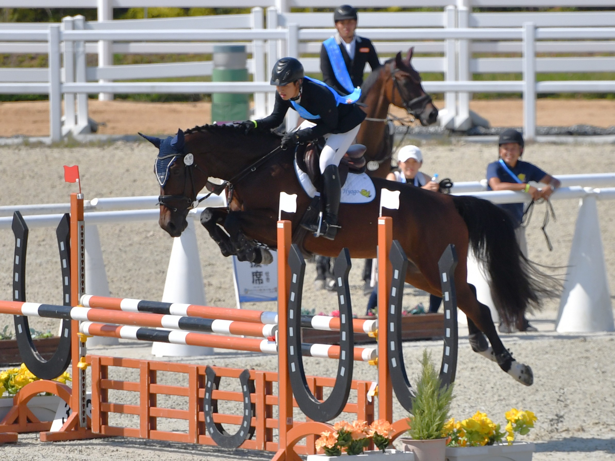 この競技には22人馬が出場、ちょうど半数の11人馬がジャンプオフに進みました。ダブルクリアラウンドは5人馬。トップタイムの23.38秒を出した治武しおり&クインティナ(滋賀県)が優勝しました。2位は29.74秒の広田思乃&キャンベラZ(栃木県)、3位は30.43秒の坂田亜紀子&ペッパ(広島県)となりました。