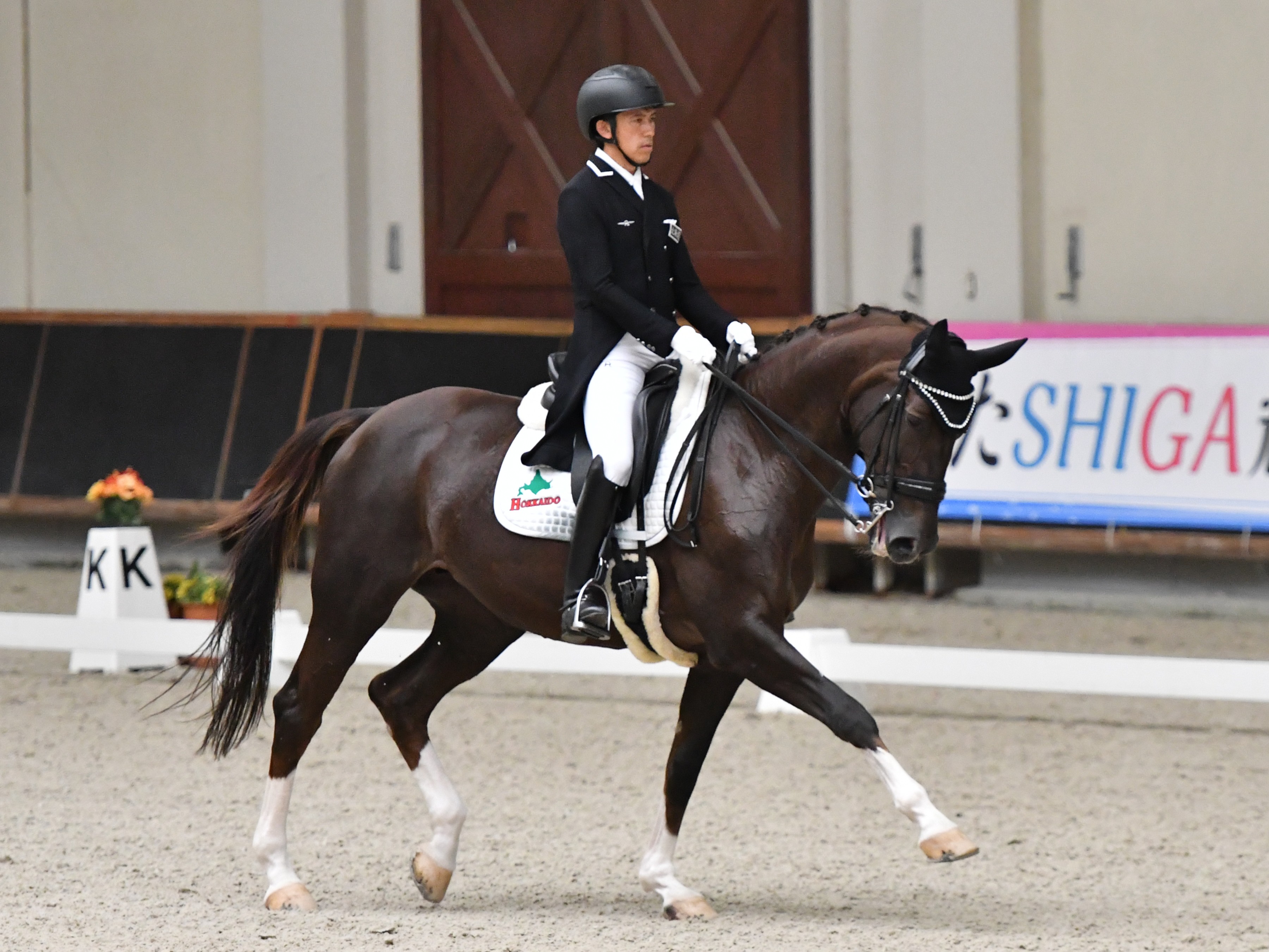 自由演技国体成年馬場馬術課目で実施したこの競技には11人馬が出場、上位3人馬は70%を超える結果でした。林伸伍&ダイアモンドダンス(北海道)が72.015%で初日の規定課目に続いて優勝、池添学&フューチャー(滋賀県)が70.635%で2位、稗田龍馬&アムステルダム(兵庫県)が70.255%で3位となりました。