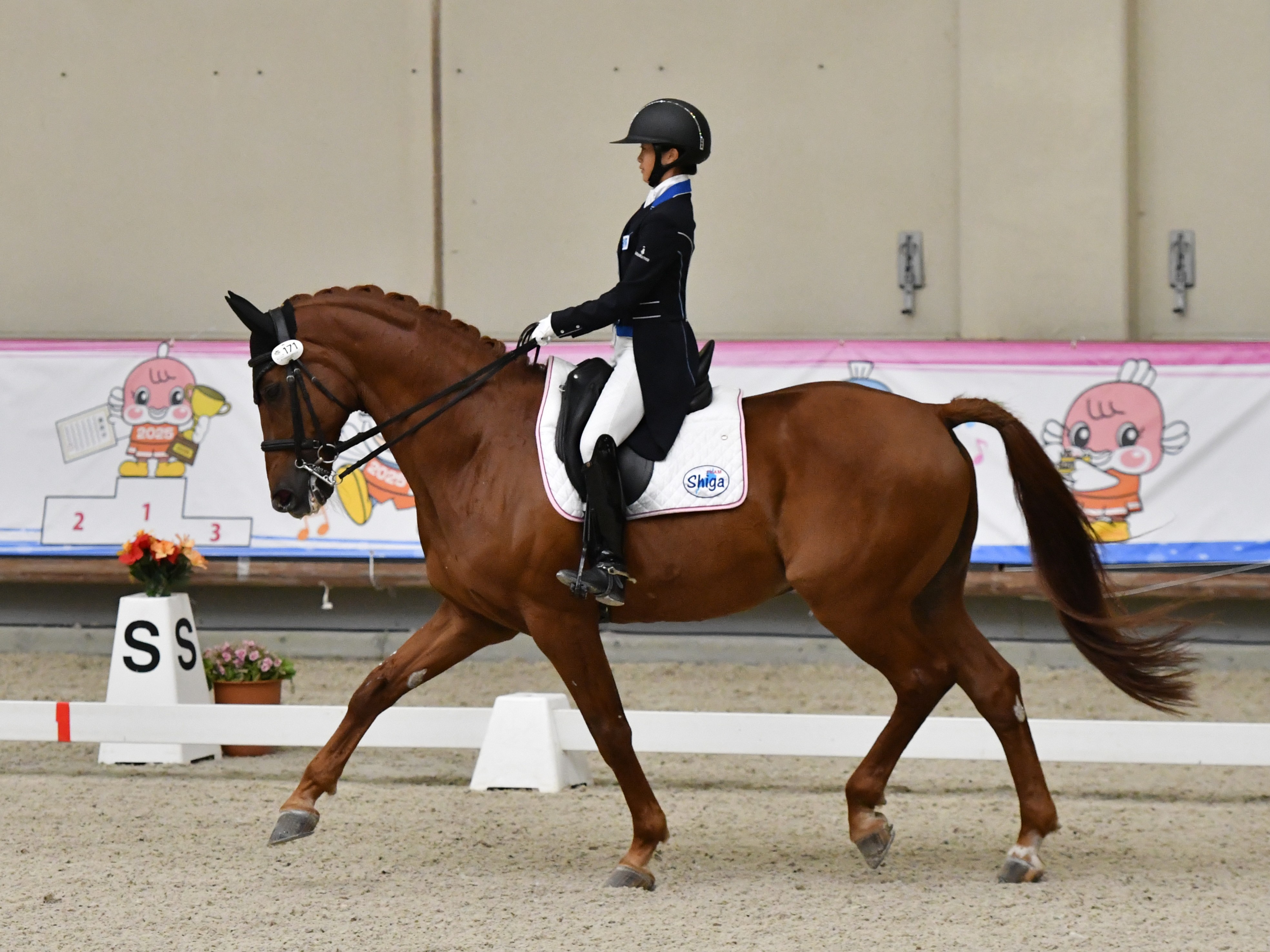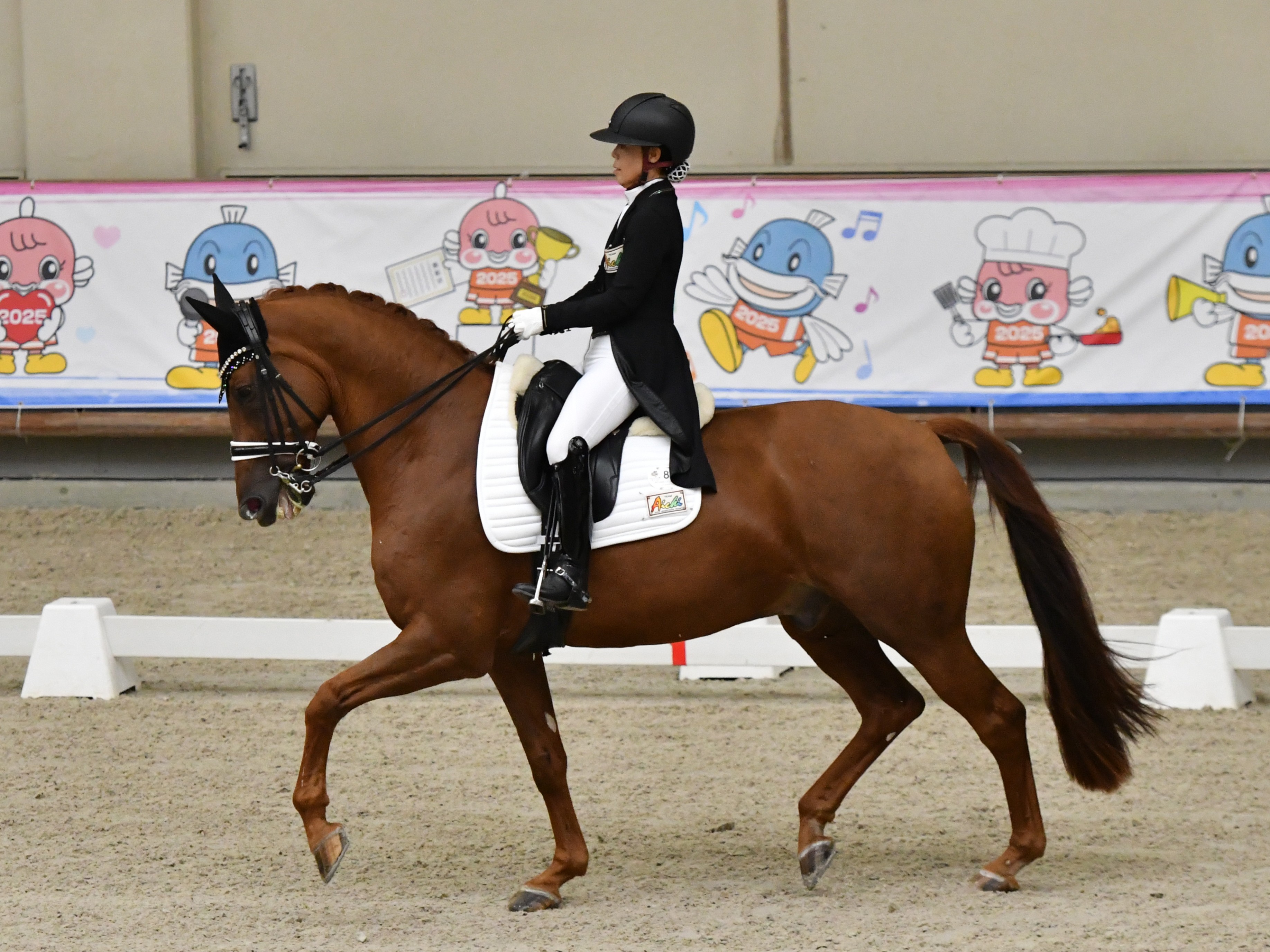 この競技はFEI自由演技ジュニアライダー馬場馬術課目で実施、8人馬が出場しました。開催県の滋賀代表の池添桃花&フュルストアマンテが断トツの70.645%を出して優勝、2位は66.950%の壷井彩乃&フルリオ(奈良県)、3位は66.425%の乗松柚羽&マキシマス(千葉県)となりました。