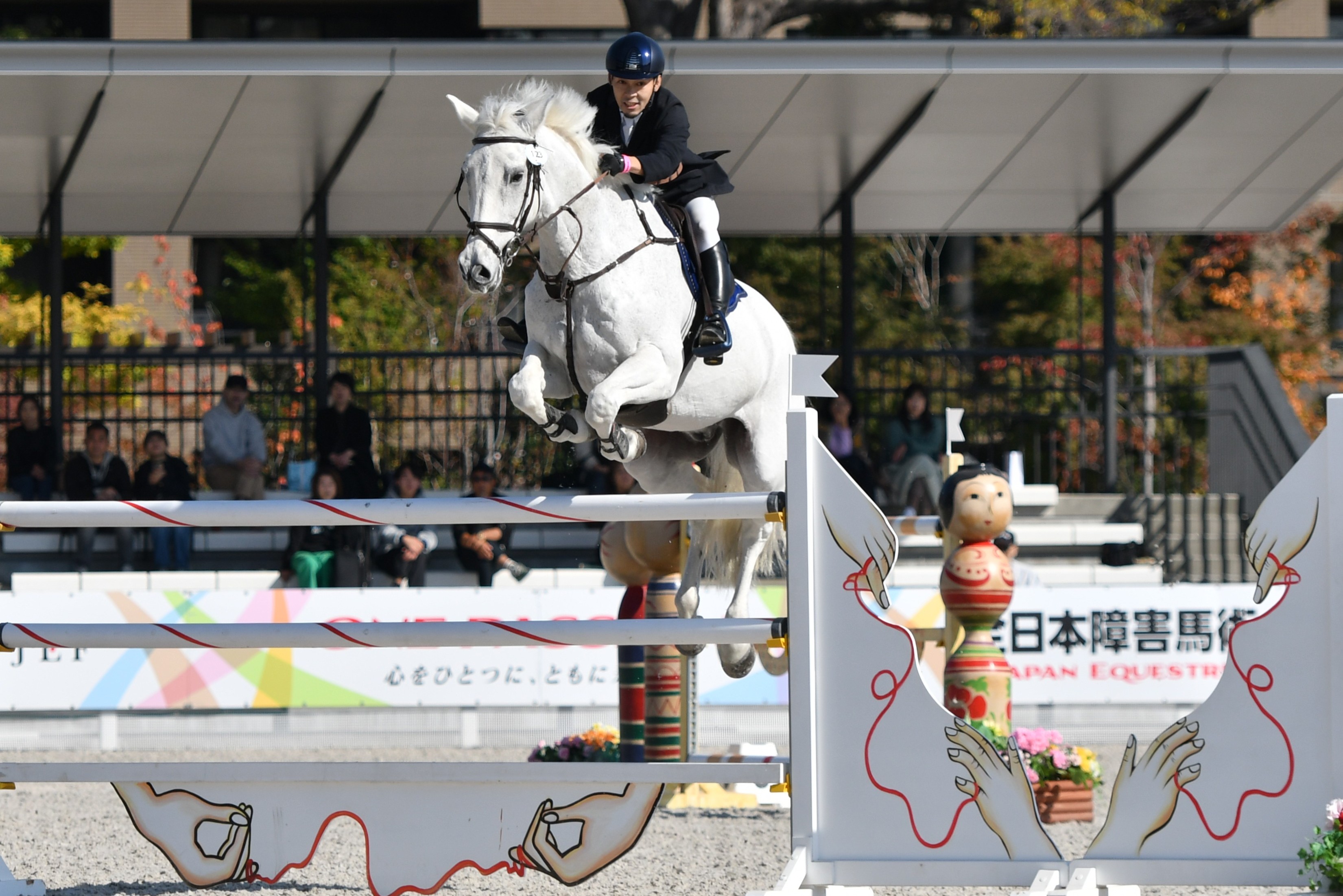 中障害A標準競技には31人馬が出場しましたが、クリアラウンドは石丸千愛季&オデソン(JRA競馬学校)のみでした。2位はタイム減点1の池田弘彰&ウィレム・ファーイースト(OISO乗馬クラブ)、3位は減点4の中で最もタイムが早かった桝井俊樹&シャリナDP(乗馬クラブクレインオリンピックパーク)となりました。