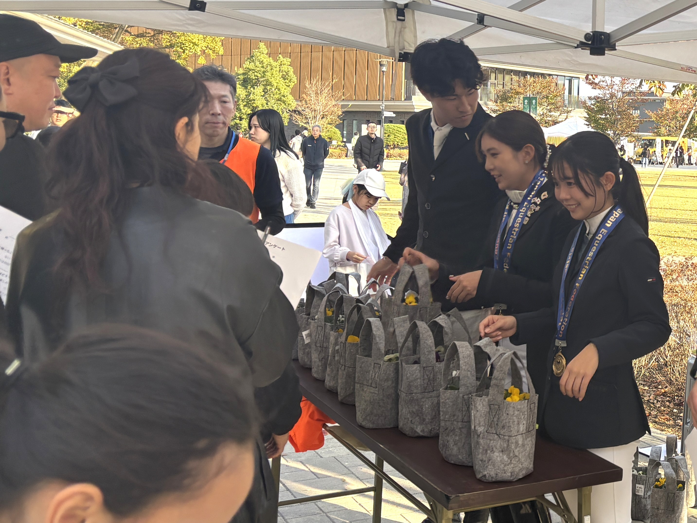 障害馬術ジュニアライダーチャンピオン鈴木瑠利夏選手、馬場馬術ヤングライダーチャンピオン吉田真理恵選手、総合馬術ヤングライダーチャンピオン細野光選手もゲストとして参加、キッズとふれあって馬術の魅力を伝えてくれました。また、大障害飛越競技終了後に競技アリーナに入る時間を設けると、キッズたちは自分の身長と同じくらいの高さの障害物に感嘆していました。その他、馬糞たい肥を使った花植え体験やポニーとのふれあいも行いました。